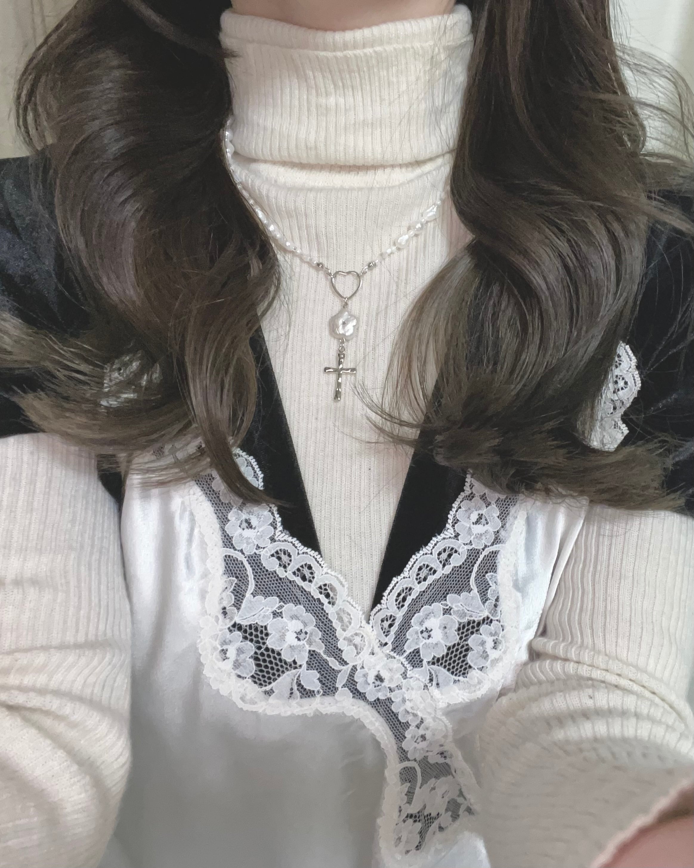 ・ pearl rosary. "真珠のロザリオ" お花型のパールに ガラスストーンを貼り付け、 十字架とハートを繋げたネックレス. 真珠のロザリオをイメージしています♡ これからの季節にはタートルネックと合わせていただいてもとっても可愛いです. 季節問わずお使いいただけます. マグネットで留めつけるタイプに仕立てました. ・ ーーーーーーーーーーーーーーーーーー 【ご留意事項】 丁寧に製作していますが ハンドメイドのため、ご理解の上 お召しいただけますようお願いいたします. また、強度は既製品に劣りますので、 やさしく扱っていただけますと幸いです. ◯大きさ 全長約45cm ◯到着まで ご入金確認後から 1~2週間でお届けよていです♡ ◯発送について ・普通郵便(定形外郵便) 送料無料 ・ヤマト運輸(ネコポス) +290円 をお選びいただけます. 普通郵便(定形外郵便) をご選択いただいた場合は 送料無料です☄︎ ヤマト運輸(ネコポス) ネコポスをご選択いただきますと +290円(全国一律)の送料がかかりますが、 追跡番号有り・全国翌日配達となりますので 追跡番号希望の方や なるべく早いお届けを希望の方は こちらをおすすめします. ※別々に複数のご注文を頂きました場合は 同梱発送させていただきますので よろしくおねがいいたします. また、定形外郵便は送料無料ですが、 ネコポス希望で複数回ご注文の場合には 1件のみネコポス便でご選択いただき、 2件目のご注文以降は定形外郵便を ご選択いただければと思います. 同梱し、一件分の送料でネコポス発送いたします. ※発送は国内のみ対応です お読みいただき ありがとうございました. 心を込めて包装いたします よろしくおねがいいたします♥